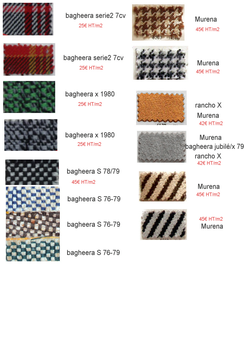 Bonsoir, Je me permet juste de rajouter que l'association a en stock un peu plus de 9 metres de tissus tweed vert/blanc , bagheera S 76-79 , la quantité permet de faire 2 voitures complètes. Ce tissus est au programme des refabrications , mais si il y en as qui ne veulent pas attendre  . Tarifs Membres association 40 euro le mètre linéaire sur 1,30 (ou 1,40) en largeur Non membre de l'association 45 euro le mètre .